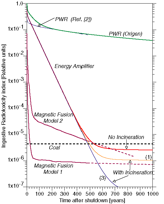 The cool-down time is in general shorter for MF, but in both cases it does not exceed about 500 years, after which period materials can be safely stored at a shallow depth (like in the case of Coal ashes). The volume of “waste” is much larger in the case of MF, which has the added presence of a large stockpile of Tritium which must be extracted and re-processed on-line. Both devices after such a reasonable cool-down period are enormously cleaner (5 x 10-5 for toxicity of waste after 500 years) than the present and future generations of (Pressurised Water Reactors) PWRs.