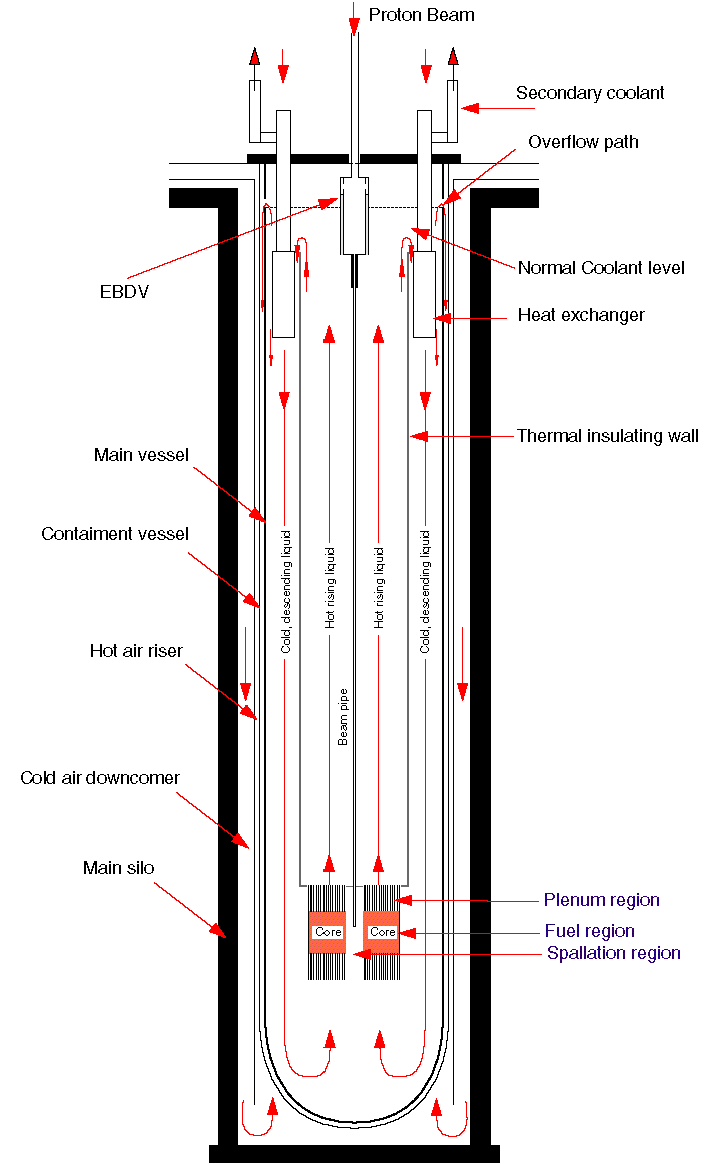 The vessel is housed below floor level in an extraordinarily robust cylindrical silo geometry lined with thick concrete which acts also as ultimate container for the liquid Lead in case of the highly hypothetical rupture of the main vessel. In the space between the main vessel and the concrete wall the Reactor Vessel Air Cooling System (RVACS) is inserted. This system, largely inspired from the ALMR design, is completely passive and based on convection and radiation heat transfer. In case of a thermal overheating, the significant dilatation of the molten Lead will raise the level of the liquid which (see Figure 2) activates (1) the RVACS cooling, (2) stops the proton beam by flooding an appropriate emergency beam stopper (EBDV) and (3) scrams the EA at a lower multiplication coefficient k <= 0.90. The whole vessel is supported at the top by anti-seismic absorbers. Even in the case of an intense earthquake the large mass of the EA will remain essentially still and the movement taken up by the absorbers.