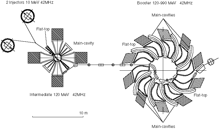 Normally the EA is well away from criticality at all times (0.95 <= k <= 0.98), there are no control bars (except the scram devices) and the power produced is directly controlled by the injected beam current. The accelerator is a synchronous cyclotron with an accelerated continuous current of 10 / 20 mA and kinetic energy of 1.0 GeV (Figure 3). It makes use of warm magnets (Bmax = 1.8 Tesla over 5 cm magnet gap) and RF-cavities. Experience with these machines has shown that the beam losses can be made sufficiently small so that no remote handling of the machine components is necessary. In particular the accelerator can be housed outside the containment region. The nominal external power provided by the beam is Pext = 12.5 MW, corresponding to a gain G = PEA/Pext= 120 (to be compared with G = 40 for MF).